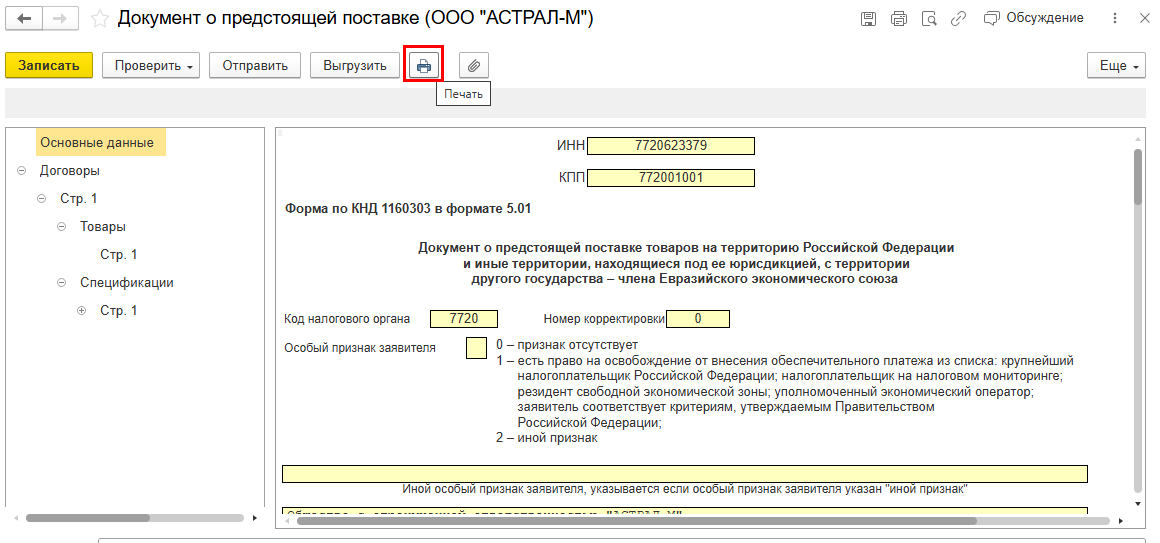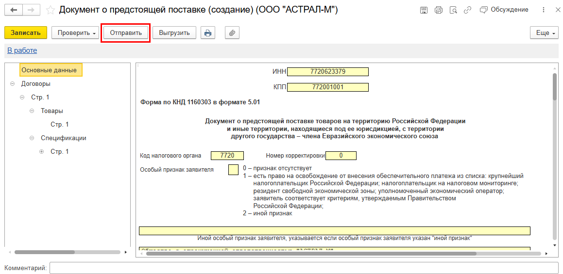 1С-Отчетность: Документ о предстоящей поставке товаров при ввозе из ЕАЭС