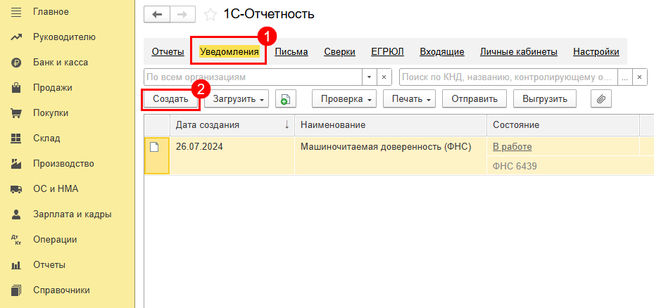 Для формирования ДОПП и получения QR-кода в 1С-Отчетность перейдите в реестр Отчеты → Регламентированные отчеты → Уведомления (1). Нажмите кнопку Создать (2):
