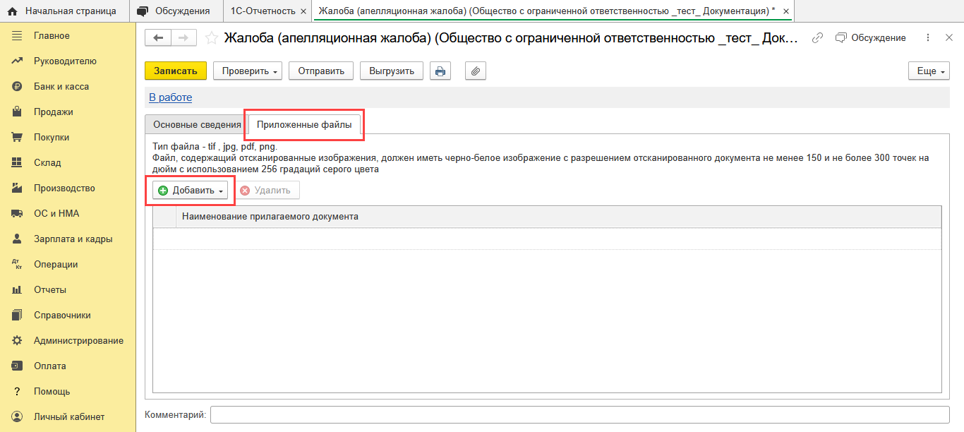 Чтобы прикрепить файлы к жалобе, откройте вкладку Приложенные файлы. Нажмите кнопку Добавить и выберите необходимый документ: