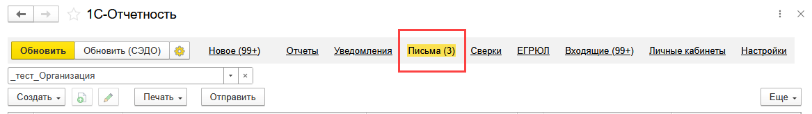 Для поступления писем от контролирующих органов в разделе Регламентированные отчеты нажмите кнопку Обновить. Полученные письма отобразятся на вкладке Входящие. Для отправки ответа на полученное сообщение воспользуйтесь кнопкой Ответить: