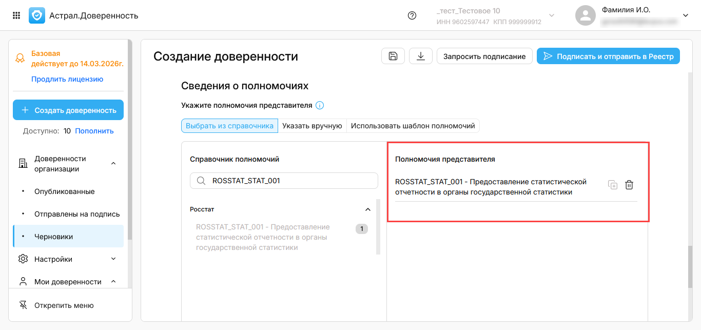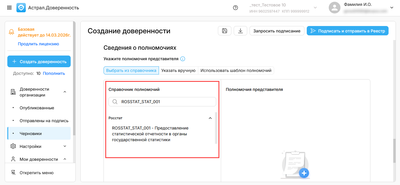 Чтобы использовать единую доверенность для сдачи отчетности в Росстат, в разделе Сведения о полномочиях выберите из Справочника полномочий ROSSTAT_STAT_001: