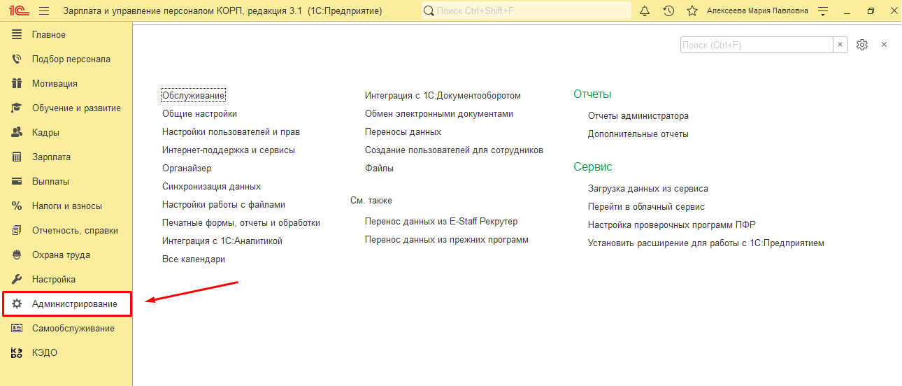 Для подключения расширения, позволяющего настроить синхронизацию программы 1С и сервиса iКЭДО, запустите информационную базу и откройте раздел Администрирование: