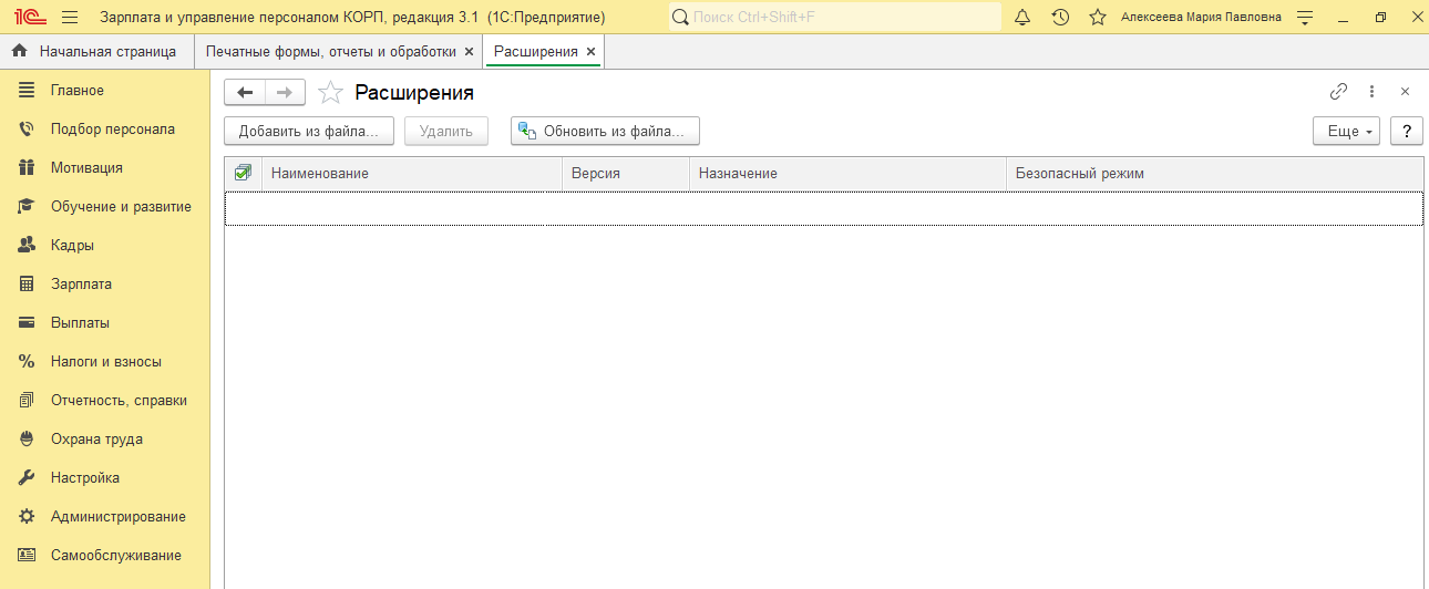 В программу успешно добавлено новое расширение, которое инициирует создание или изменение требуемых для его функционирования объектов системы, например будет создан справочник «Рабочие места»: