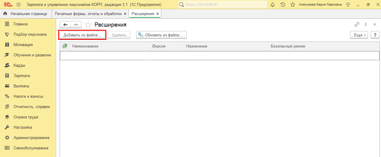Для добавления нового расширения нажмите кнопку Добавить из файла: