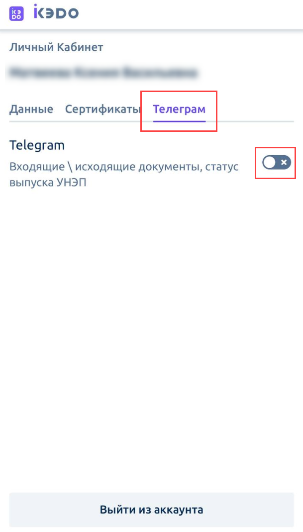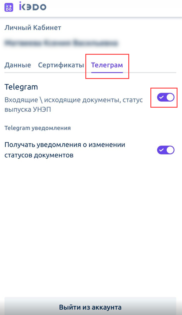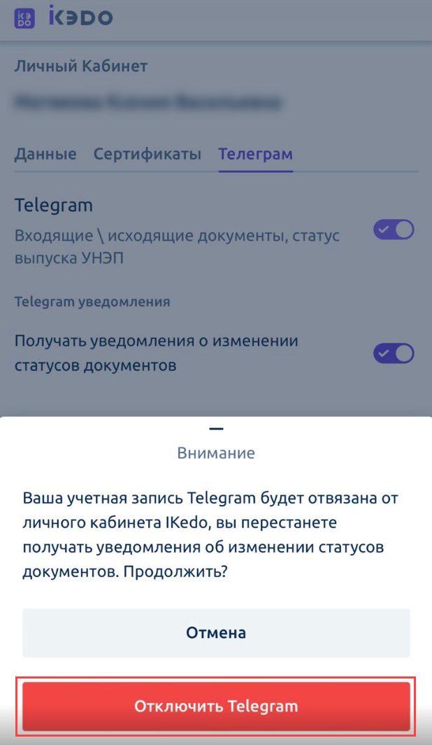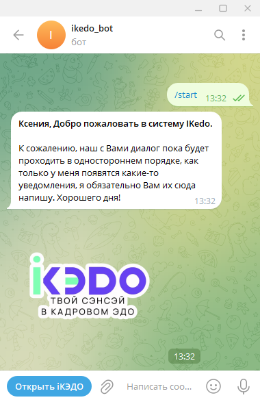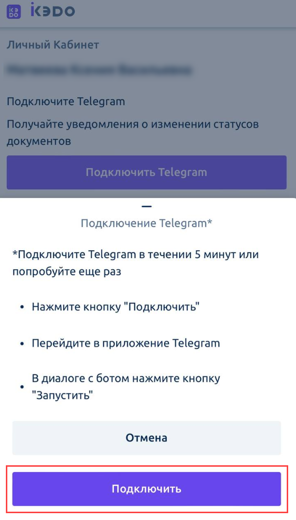 В сервисе iКЭДО появится сообщение об успешном подключении Telegram: