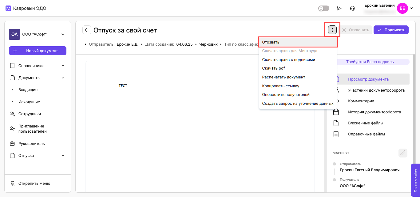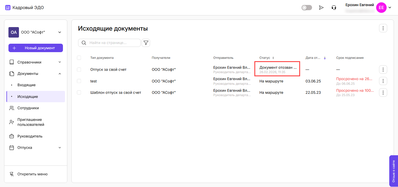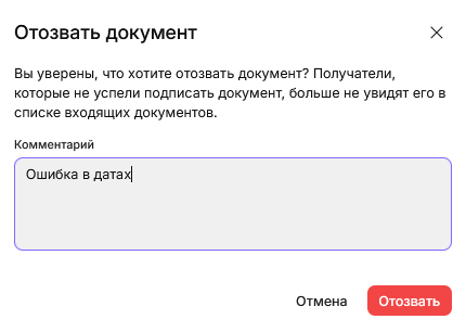 Отправитель документа может отозвать некорректный документ до того, как получатель его подпишет.