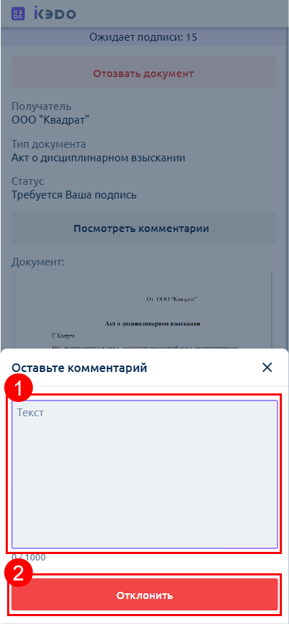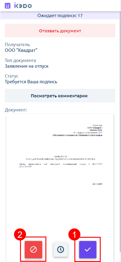 Ознакомьтесь с содержанием документа, а затем подпишите (2) или отклоните (1) его: