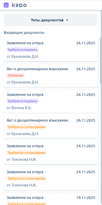 У каждого документа установлен срок подписания в соответствии с его типом (тип документа может создать только кадровый специалист). Срок подписания подсвечивается оранжевым цветом, если до истечения срока подписания остается 2 дня, красным цветом – остался 1 день или документ просрочен: