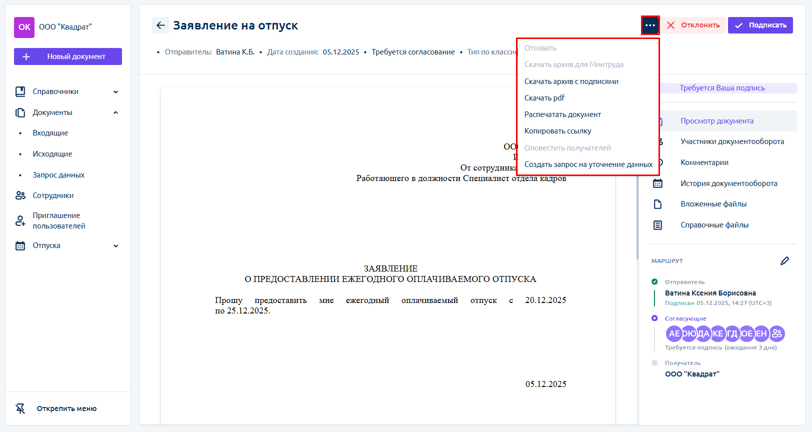 Чтобы подписать или отклонить входящий документ, воспользуйтесь кнопками Подписать или Отклонить.