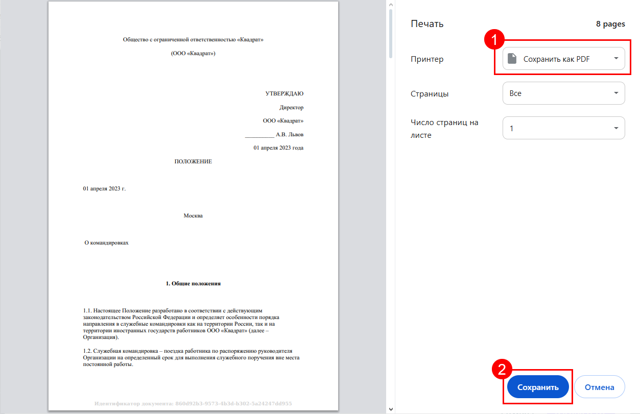 В открывшемся окне в строке Принтер выберите Сохранить как PDF (1) и нажмите кнопку Сохранить (2):