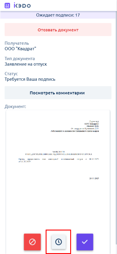 С помощью кнопки Отложить можно отложить документ в конец очереди подписания: