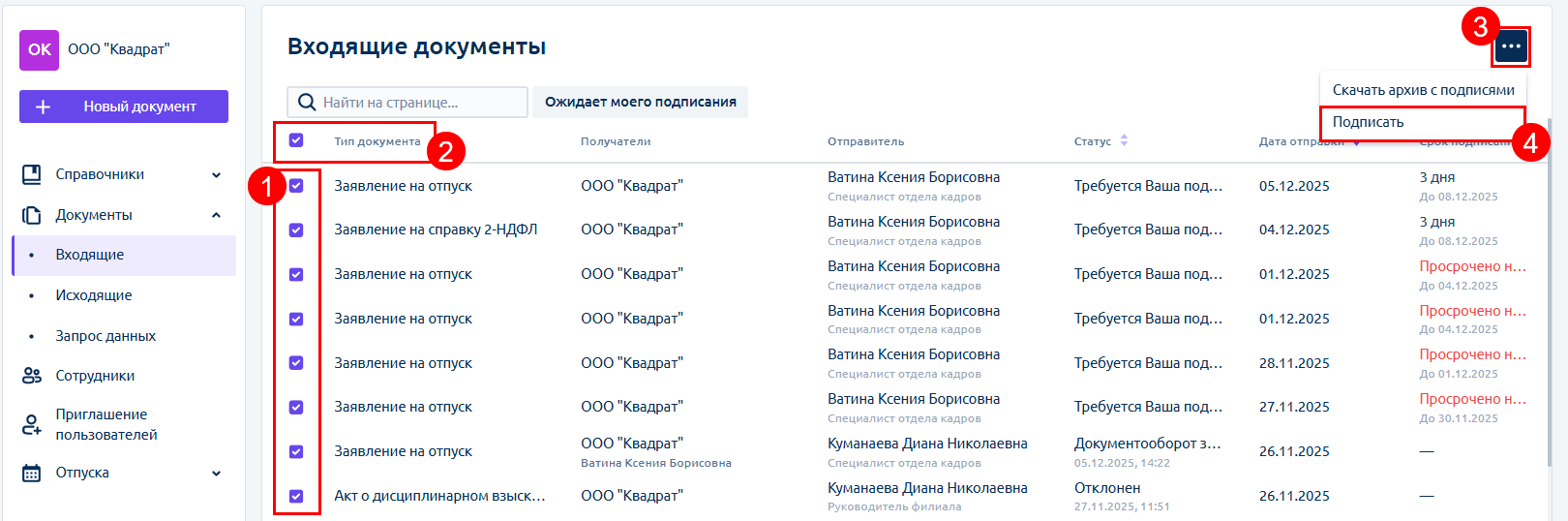 Для подписания нескольких документов выберите необходимые документы, установив напротив них флажки (1). Для выбора всех документов установите флажок Тип документа (2). Далее в правом верхнем углу нажмите на кнопку с изображением трех точек (3) и выберите Подписать (4):