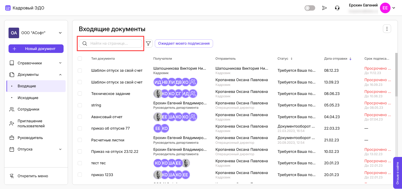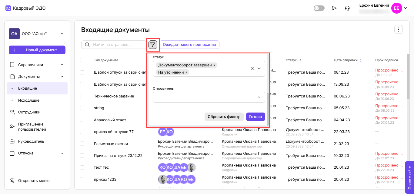 Астрал iКЭДО: Работа с фильтрами в разделе «Документы»