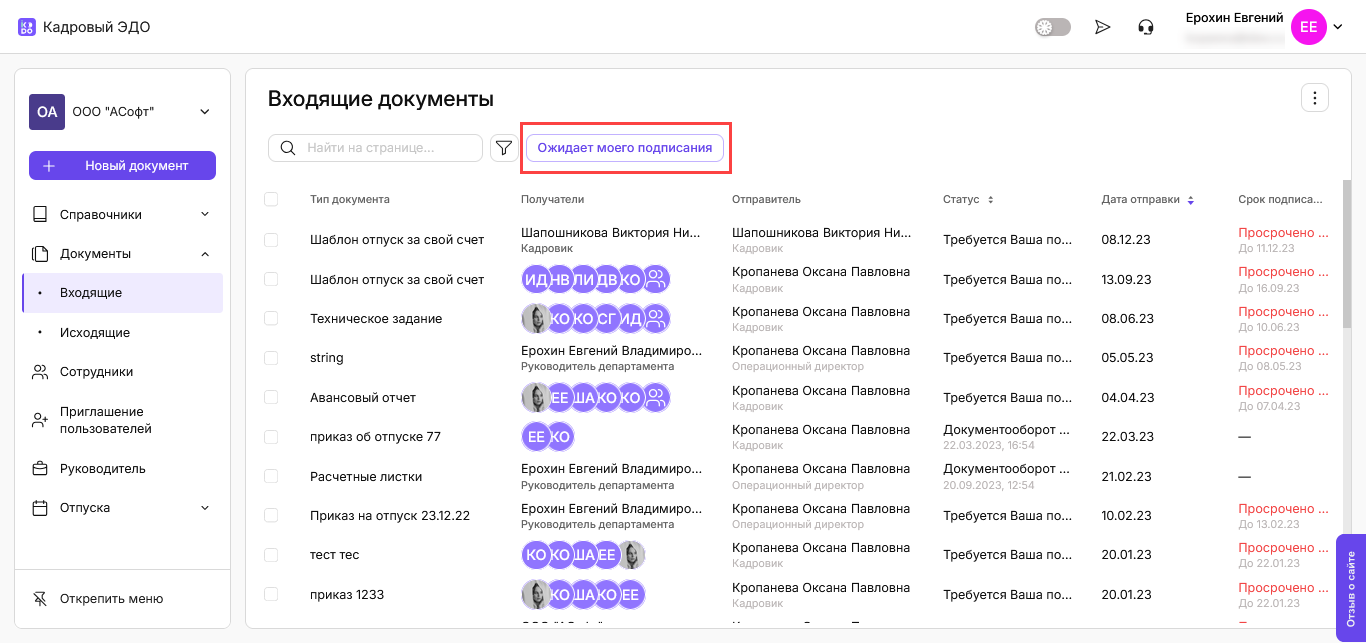 Чтобы отфильтровать документы, где требуется только подписание текущего пользователя, нажмите кнопку Ожидает моего подписания: