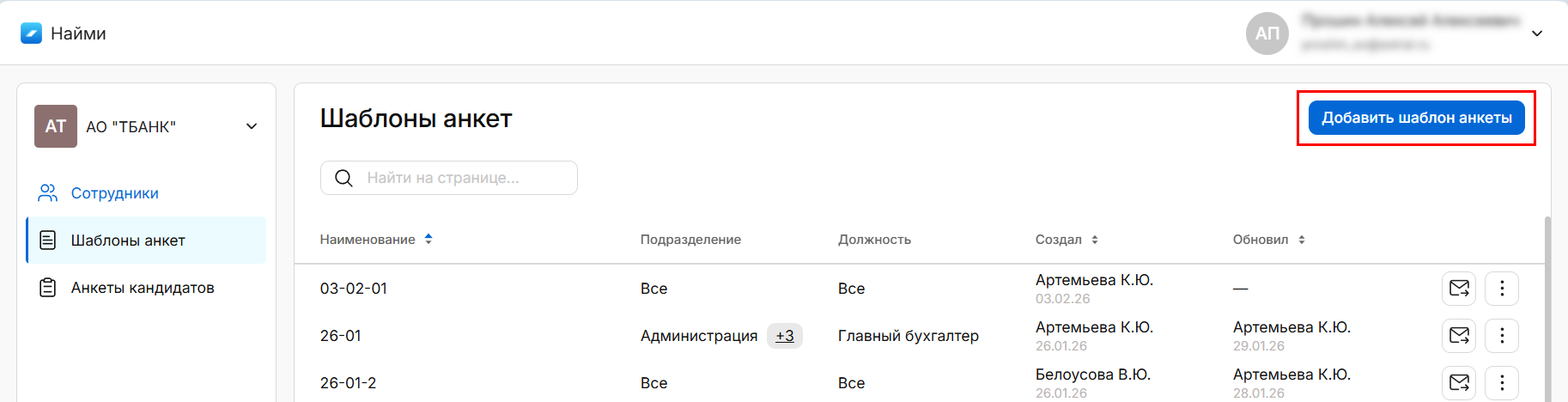 В разделе "Шаблоны анкет" отображаются добавленные шаблоны анкет. Здесь можно отправлять анкеты кандидатам и работать с активными анкетами.