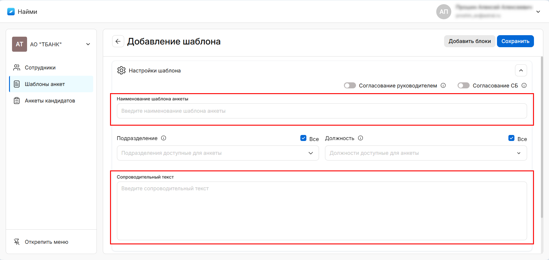В строке Наименование шаблона анкеты укажите название нового шаблона. В поле Сопроводительный текст укажите сообщение, которое будет отображаться у кандидата в анкете: