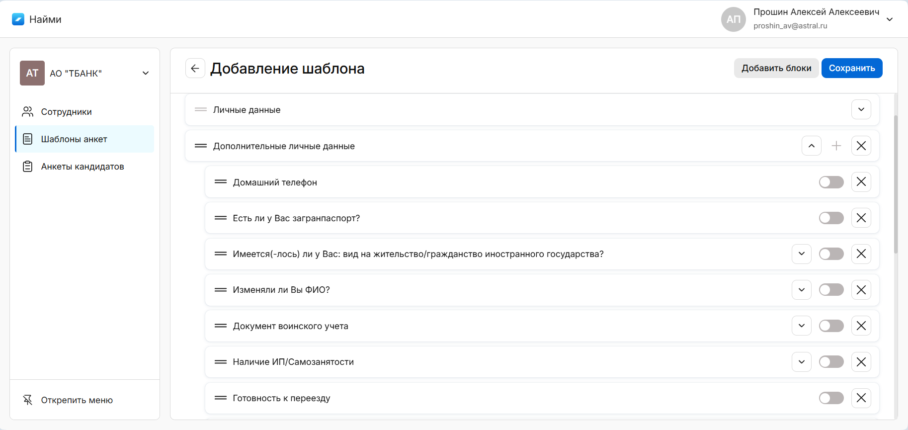 В добавленных блоках можно удалять, назначать обязательные для заполнения поля и передвигать данные, которые будут запрашиваться у кандидата в анкете: