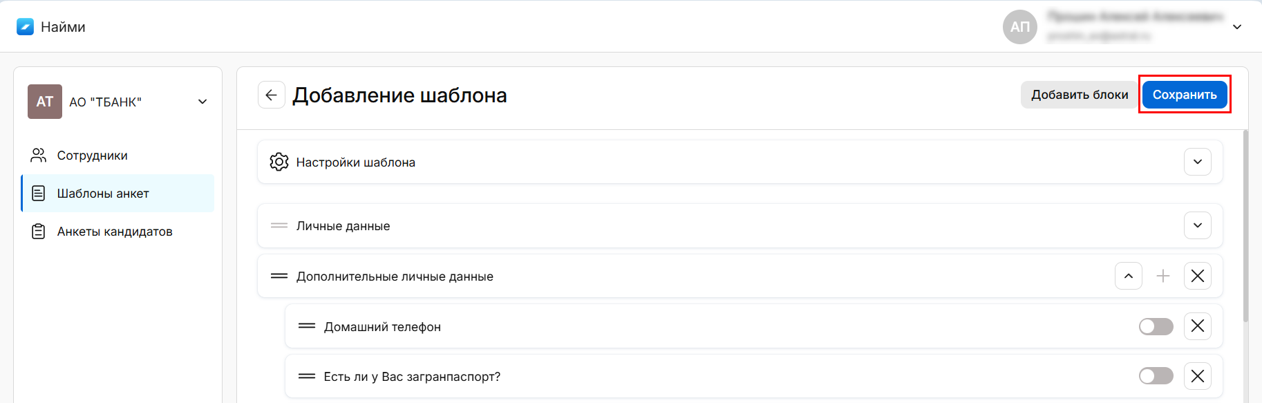 Для сохранения шаблона анкеты нажмите кнопку Сохранить:
