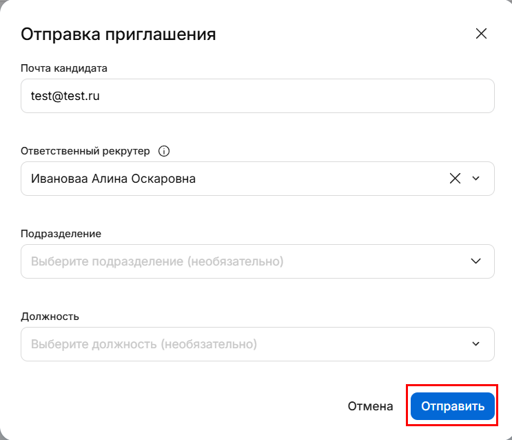 Укажите почту кандидата и выберите ответственного рекрутера. При необходимости укажите подразделение и должность.