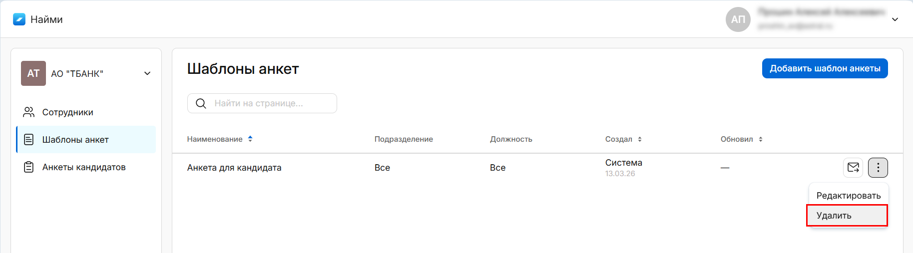 Для удаления шаблона анкеты нажмите на меню Дополнительные действия → Удалить. Удаление блокирует создание новых анкет по этому шаблону, но не мешает завершить уже начатые анкеты: