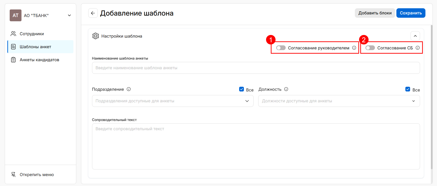 Для добавления в маршрут этапа согласования анкеты сотрудником службы безопасности (СБ) активируйте переключатель Согласование СБ (2). Если в организации отсутствуют сотрудники с ролью "Сотрудник СБ" - этап не будет добавлен в маршрут: