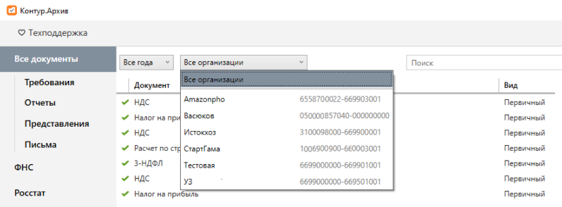 Для массовой выгрузки документов выделите в списке нужные отчеты с помощью клавиш CTRL или SHIFT. Чтобы выделить все отчеты, нажмите правой кнопкой мыши на списке и выберите пункт Выбрать все. Если нужны документы только определенной организации, используйте фильтр: