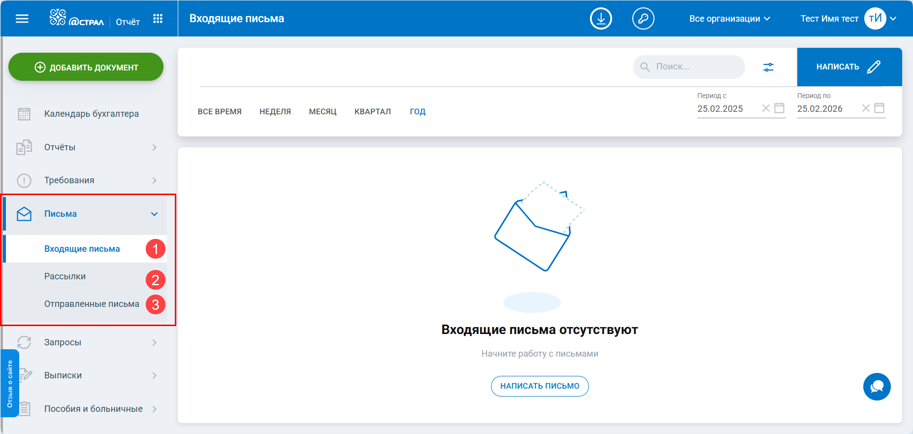 Для обеспечения неформализованного документооборота с контролирующими органами реализован раздел Письма, в котором можно обмениваться письмами с СФР (при наличии старого регистрационного номера ПФР) и Росстат. Раздел содержит подразделы для входящих писем от контролирующих органов (1), информационных сообщений (рассылку) (2) и отправленных писем (3):