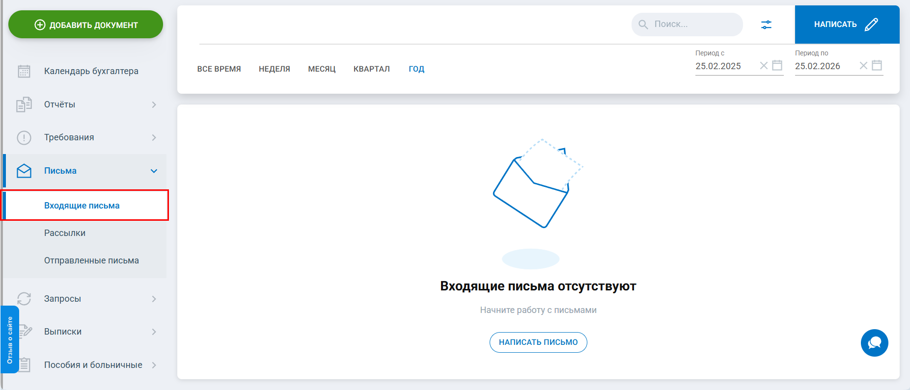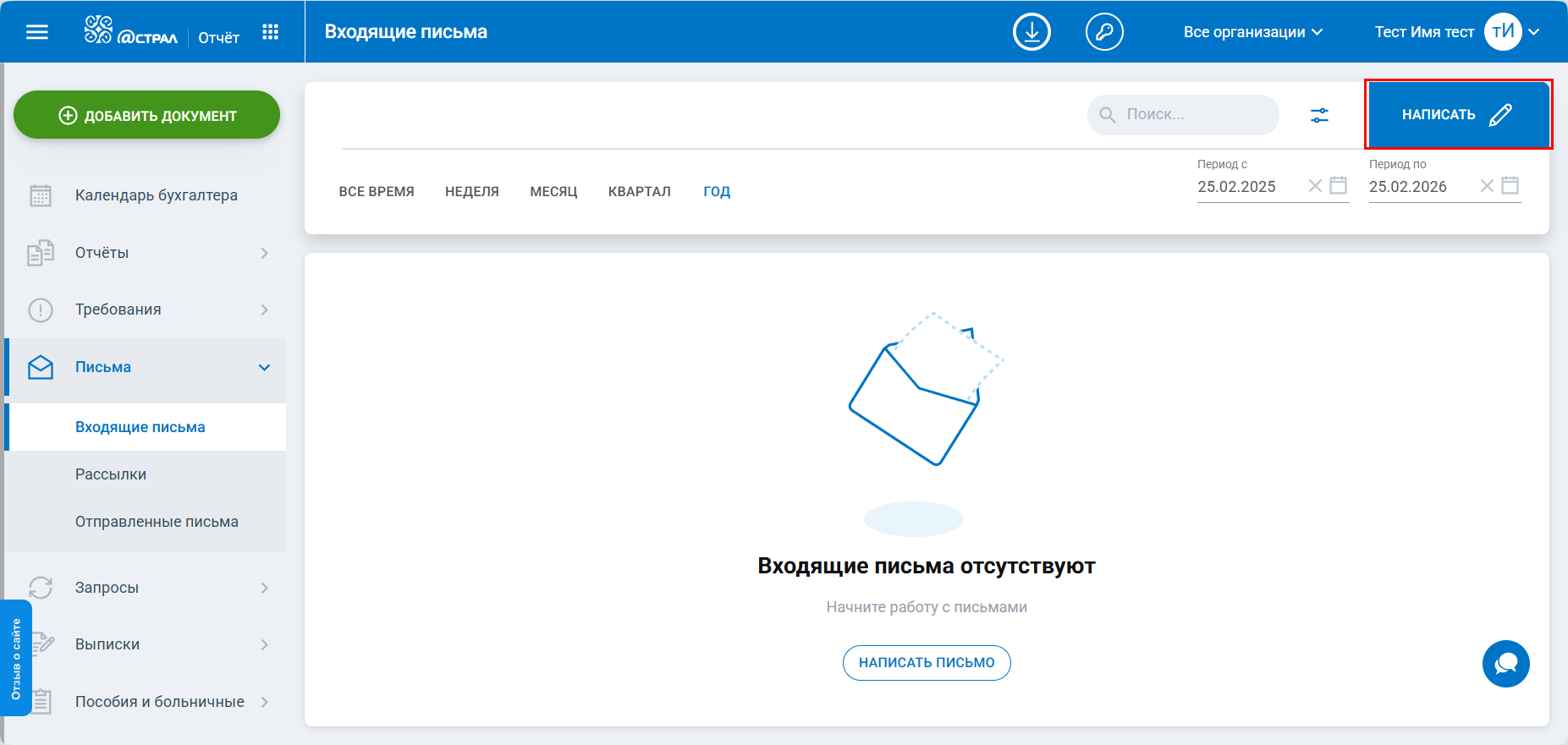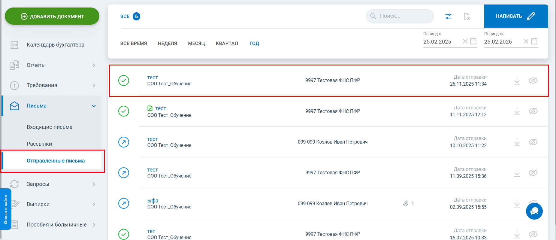 Нажмите кнопку Отправить. Письмо будет отправлено в указанный контролирующий орган и переместится в раздел Отправленные письма: