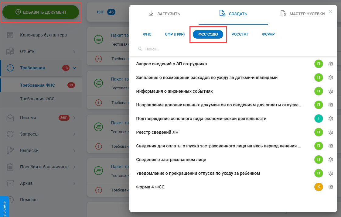 Для создания уведомлений нажмите кнопку Добавить документ и выберите направление ФСС СЭДО: