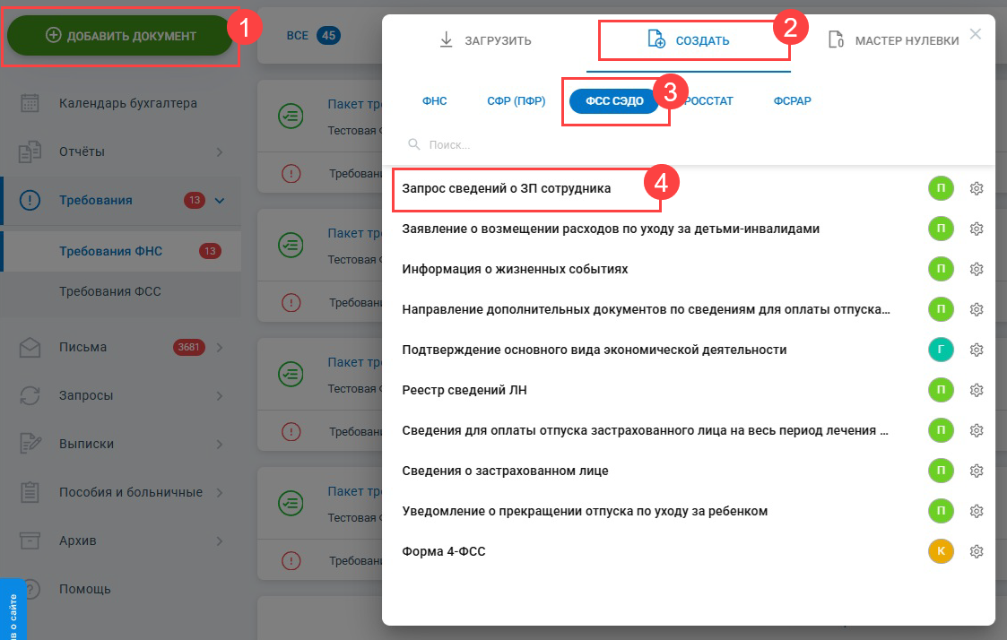 Для создания запроса страхователя о получении от Фонда сведений о заработной плате застрахованного лица нажмите кнопку Добавить документ (1) → Создать (2) → ФСС СЭДО (3) → Запрос сведений о ЗП сотрудника (4):