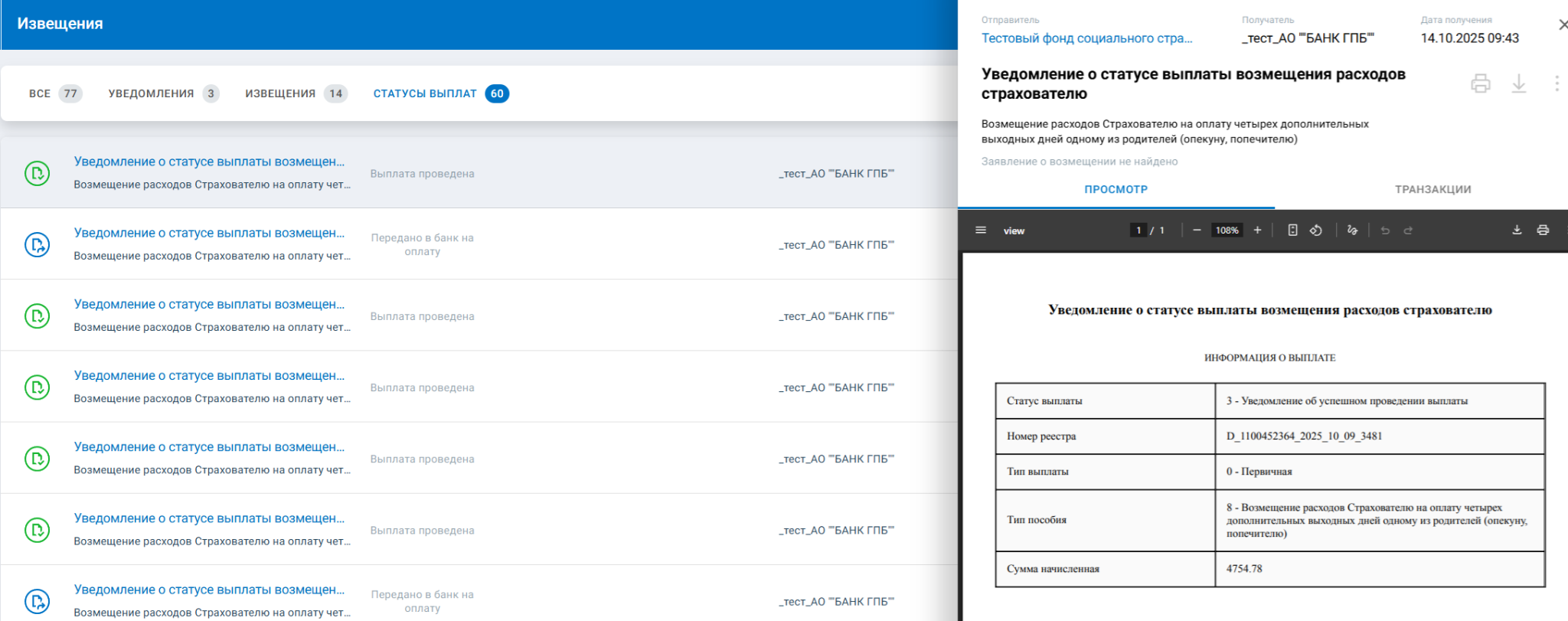 - Уведомление о статусе выплаты возмещения расходов страхователю: уведомление (по спецификации СЭДО тип сообщения 11010) будет поступать по итогам обработки "Заявления о возмещении расходов по уходу за детьми-инвалидами". Уведомление носить исключительно ознакомительный характер, отвечать/подтверждать его не требуется.