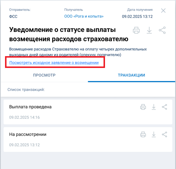 Аналогично можно перейти из детальной информации заявления о возмещении по гиперссылке обратно к уведомлению о статусе выплаты.