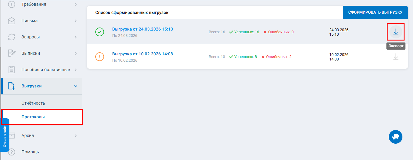 Данные о выгрузках будут доступны в реестре Выгрузки → Протоколы. Чтобы скачать выгрузку, нажмите кнопку Экспорт: