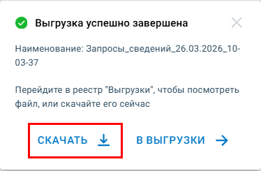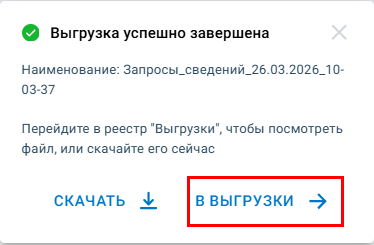 Выгружаемые из реестров отчеты и протоколы сохраняются в разделе "Выгрузки", что позволяет их быстро находить и повторно использовать.