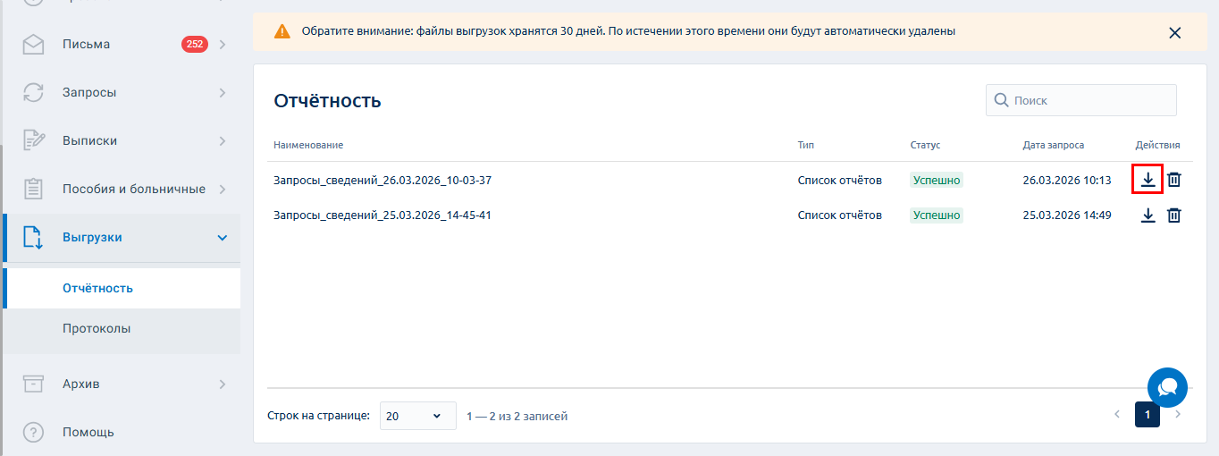 Файлы выгрузок хранятся 30 дней. По истечении этого времени они будут автоматически удалены.