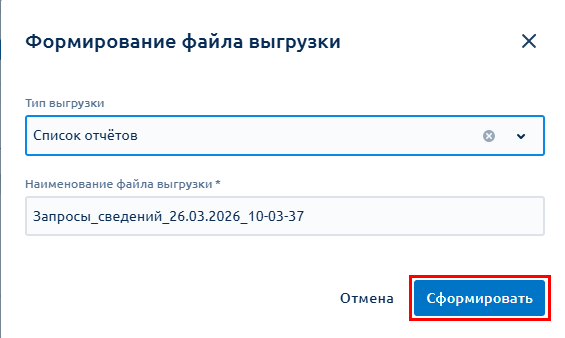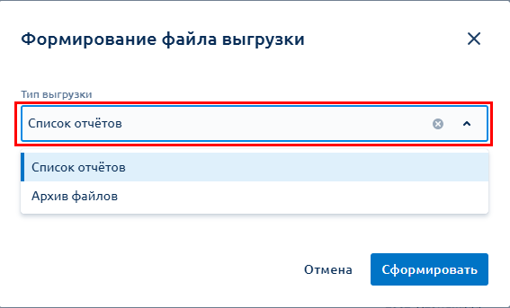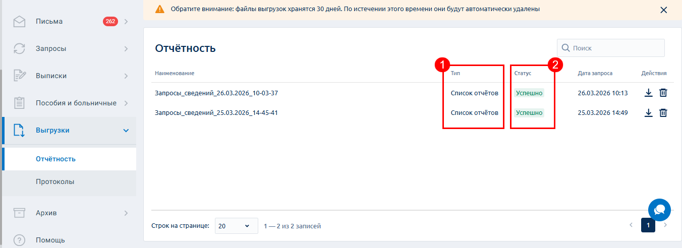 - Тип (1) отображается тип выгрузки, который был выбран в момент ее формирования;