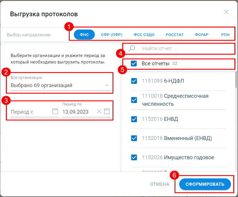 В окне Выгрузка протоколов есть возможность: отфильтровать список печатных форм документооборотов по направлению (1), организациям (2) и периоду отправки (3). Также необходимую форму можно найти с помощью строки поиска (4) или отметить пункт Все отчеты (5), чтобы выгрузка осуществилась по всем формам. После выбора необходимых протоколов нажмите Сформировать (6):