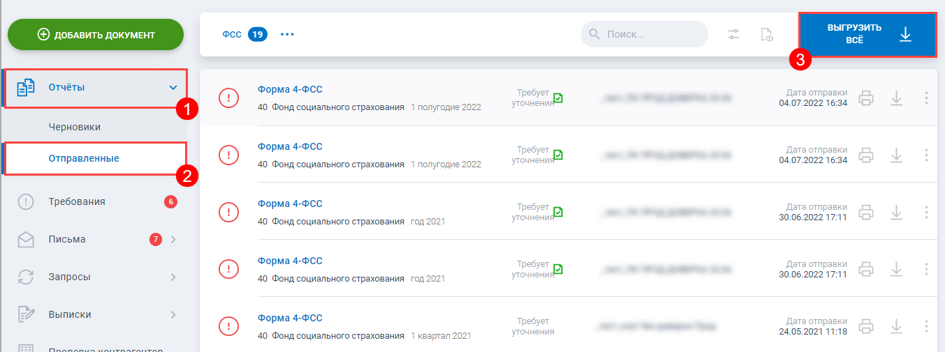 Способ 1. Перейдите в реестр отправленных отчетов: Отчёты (1) → Отправленные (2). Нажмите кнопку Выгрузить всё (3):