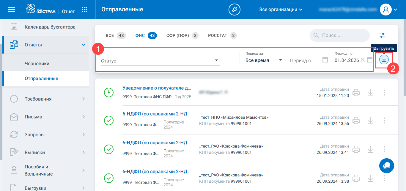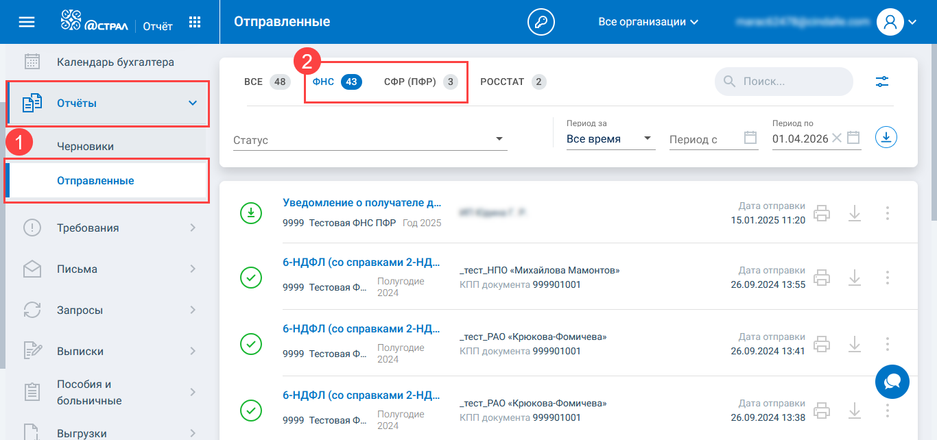 Для формирования выгрузки откройте раздел Отчёты → Отправленные (1). Выберите направление ФНС или СФР (ПФР) (2):