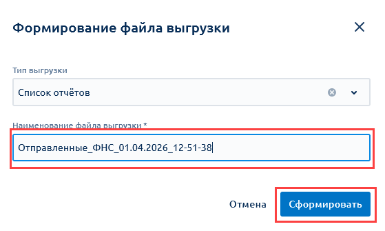 В открывшемся окне при необходимости укажите наименование файла выгрузки и нажмите кнопку Сформировать: