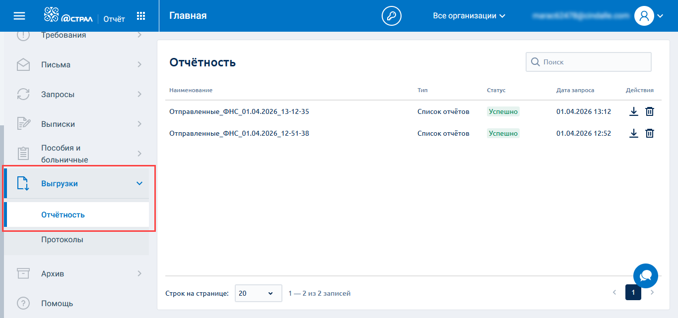Для просмотра и скачивания списка сформированных выгрузок откройте раздел Выгрузки → Отчётность: