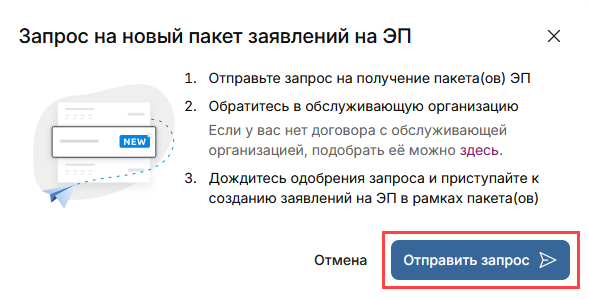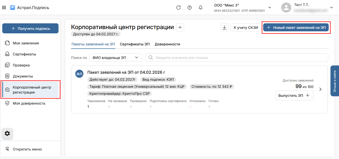 Для подключения нового пакета заявлений на главной странице раздела КЦР нажмите кнопку Новый пакет заявлений на ЭП: