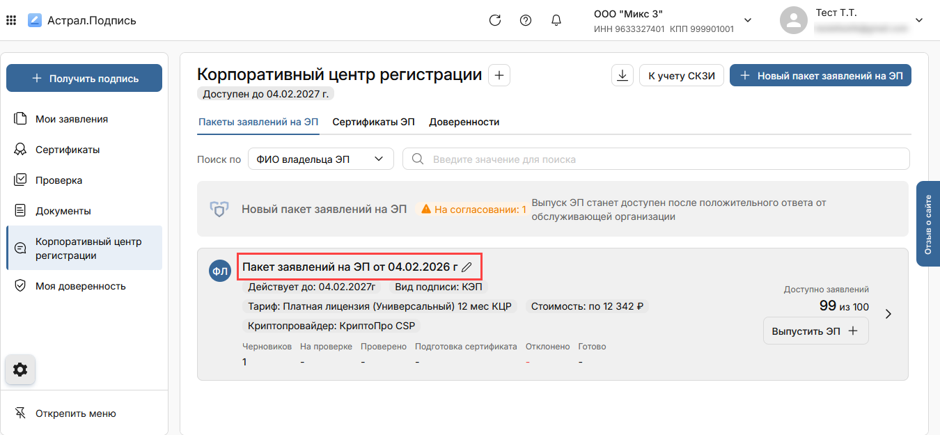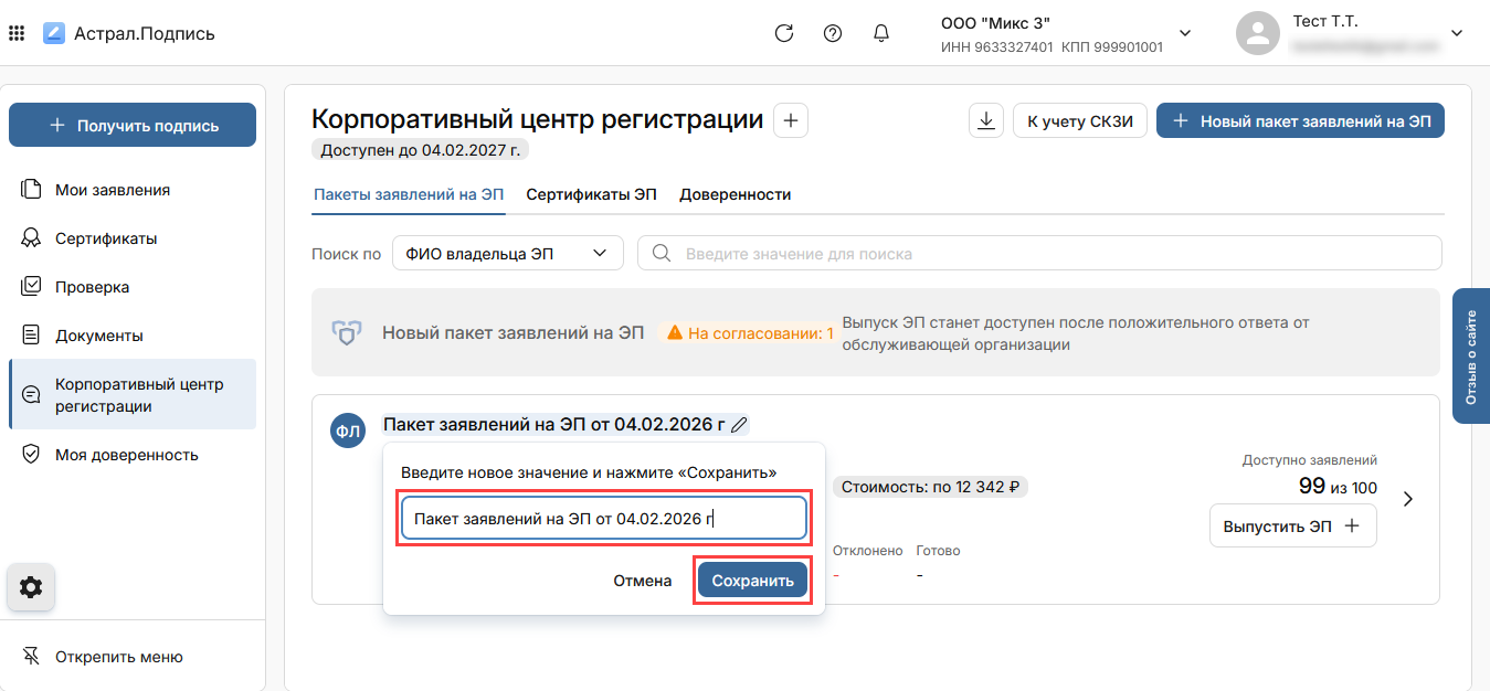 Для удобства пакет заявлений можно переименовать. Для этого нажмите кнопку Редактировать: