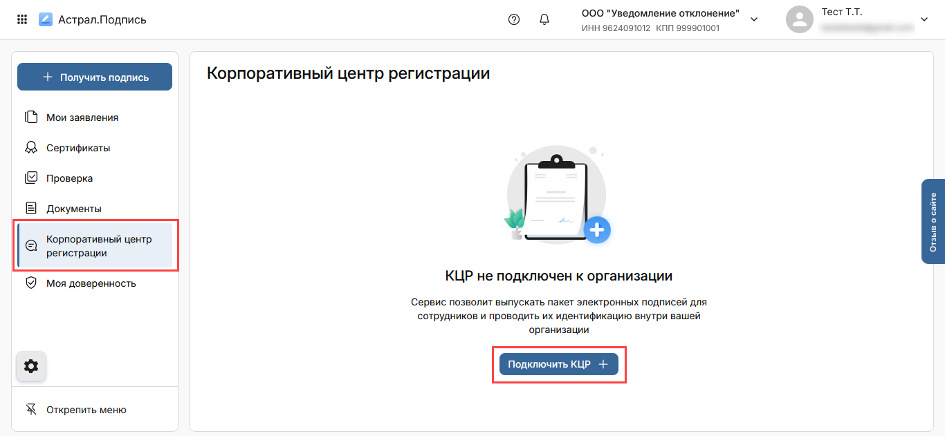 В личном кабинете перейдите в раздел Корпоративный центр регистрации и нажмите кнопку Подключить КЦР: