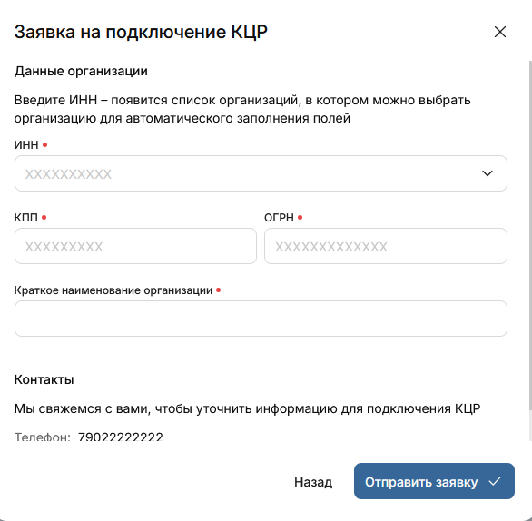 В открывшемся окне укажите данные организации и свою контактную информацию. Нажмите кнопку Отправить заявку: