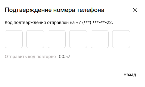 На следующем шаге введите код подтверждения, отправленный на номер телефона, который был указан при подключении сервиса КЦР:
