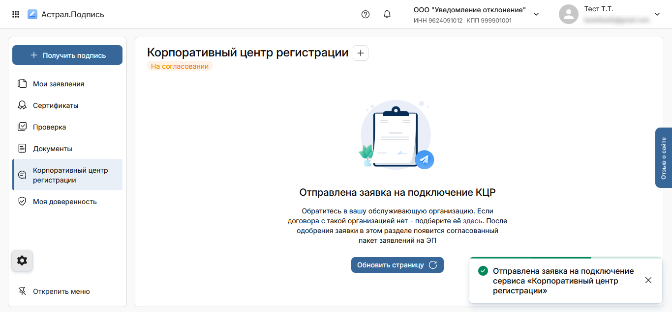 После одобрения заявки нажмите кнопку Обновить страницу. Отобразится подключенный пакет заявлений, в рамках которого можно начать формирование корпоративного заявления для выпуска ЭП.