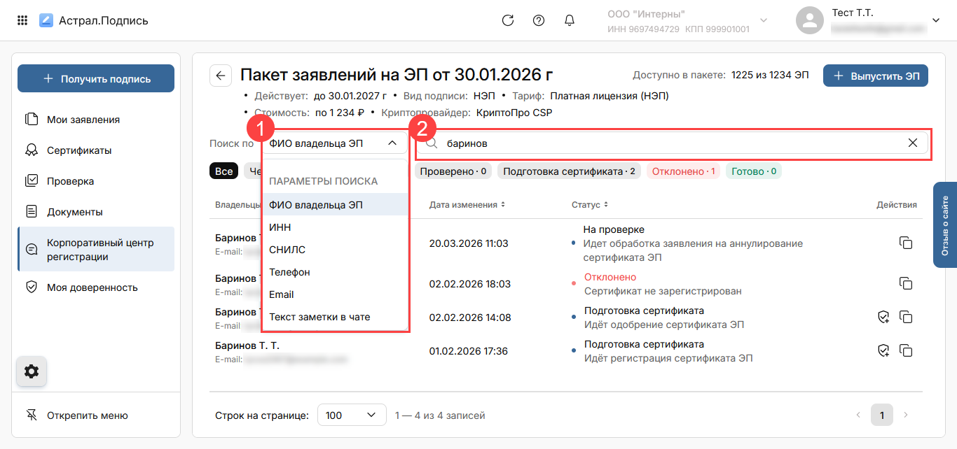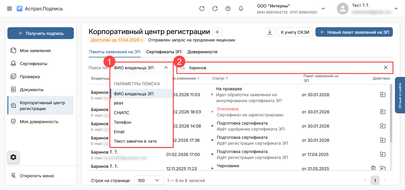 Чтобы найти заявление/черновик заявления сотрудника внутри одного пакета, перейдите в пакет заявлений. В поле поиска выберите из выпадающего списка необходимое значение (1):