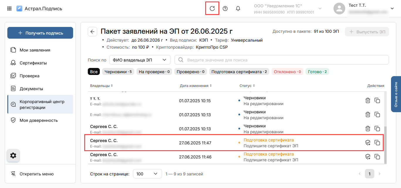Для проверки результата обработки заявления на получение сертификата электронной подписи нажмите кнопку Обновить данные заявлений. Откройте заявку в статусе "Подготовка сертификата. Подпишите сертификат ЭП":