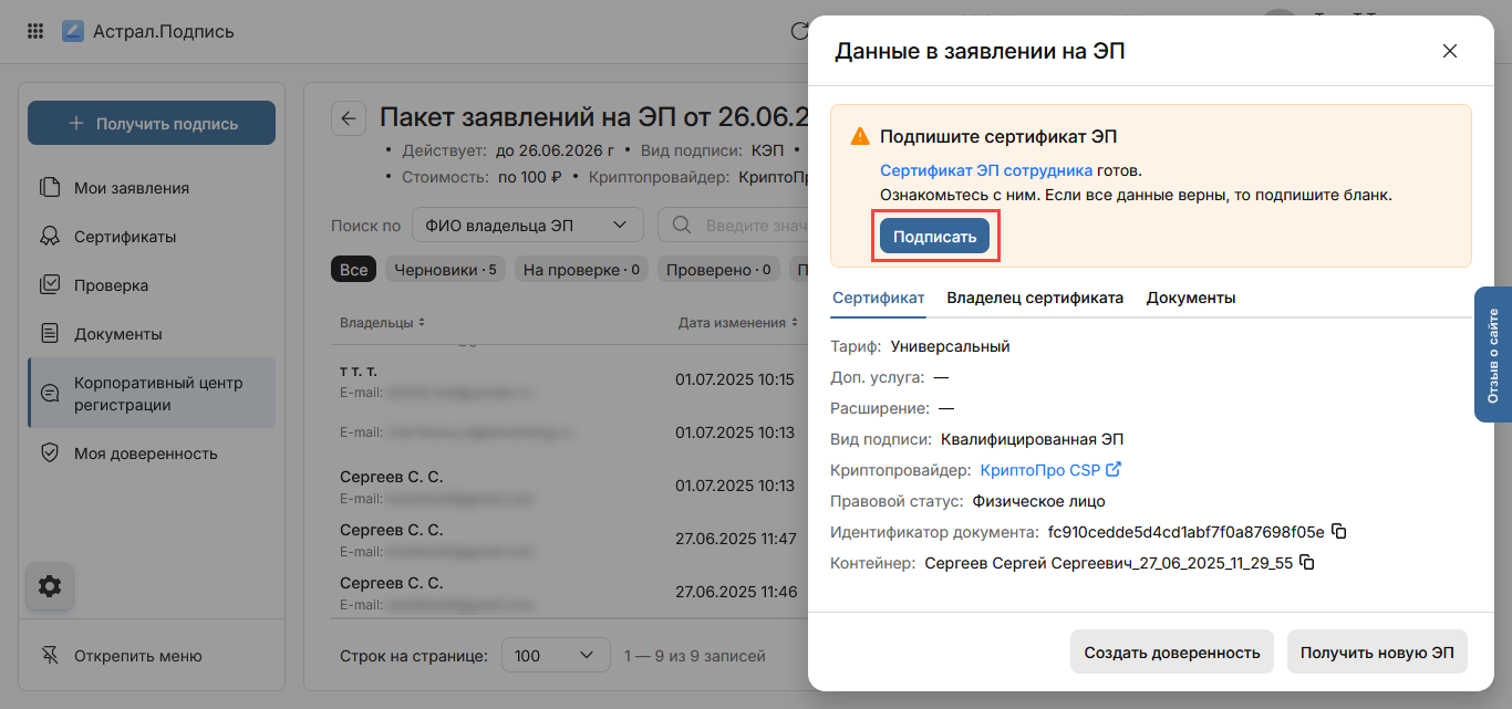 Далее необходимо выполнить подписание сертификата ЭП. Нажмите кнопку Подписать: